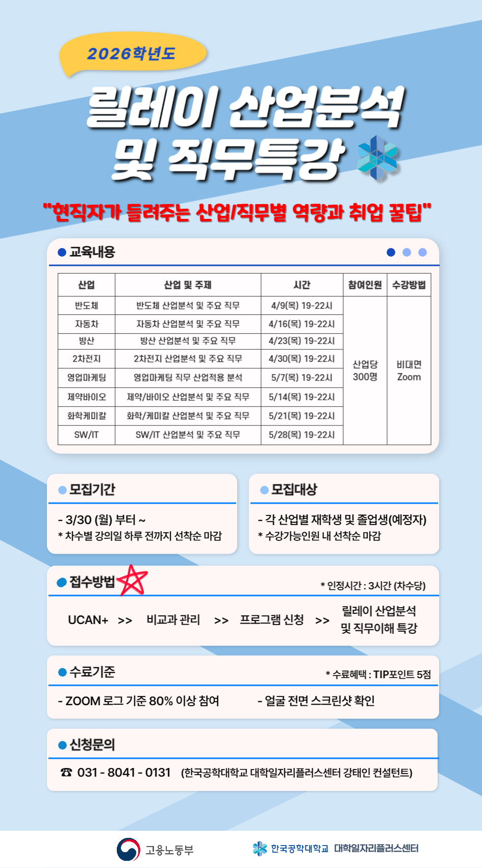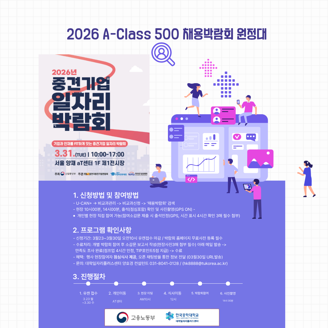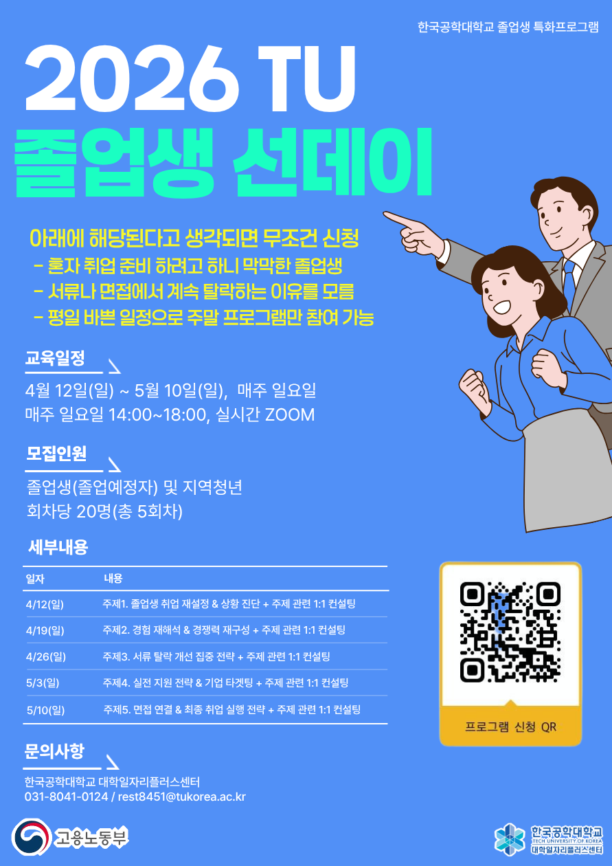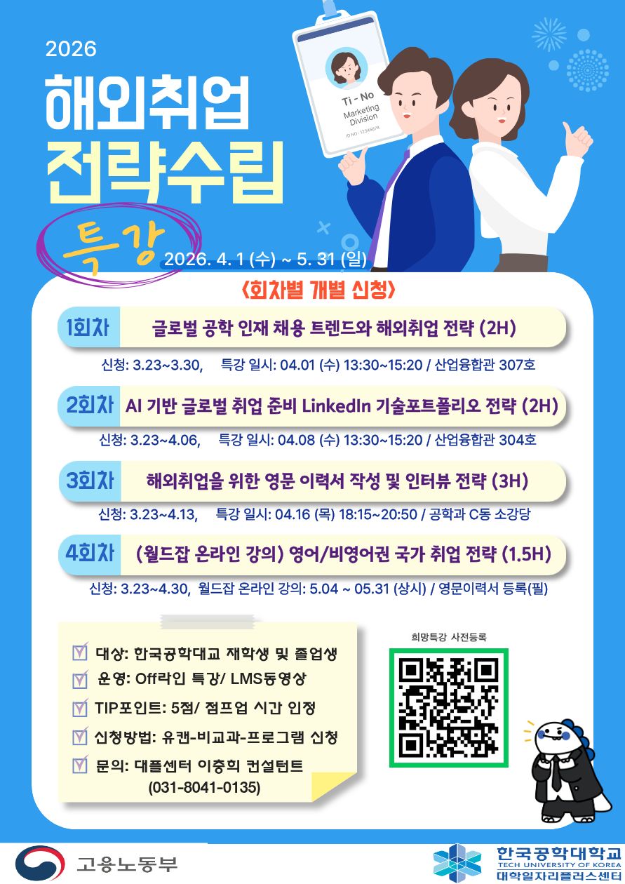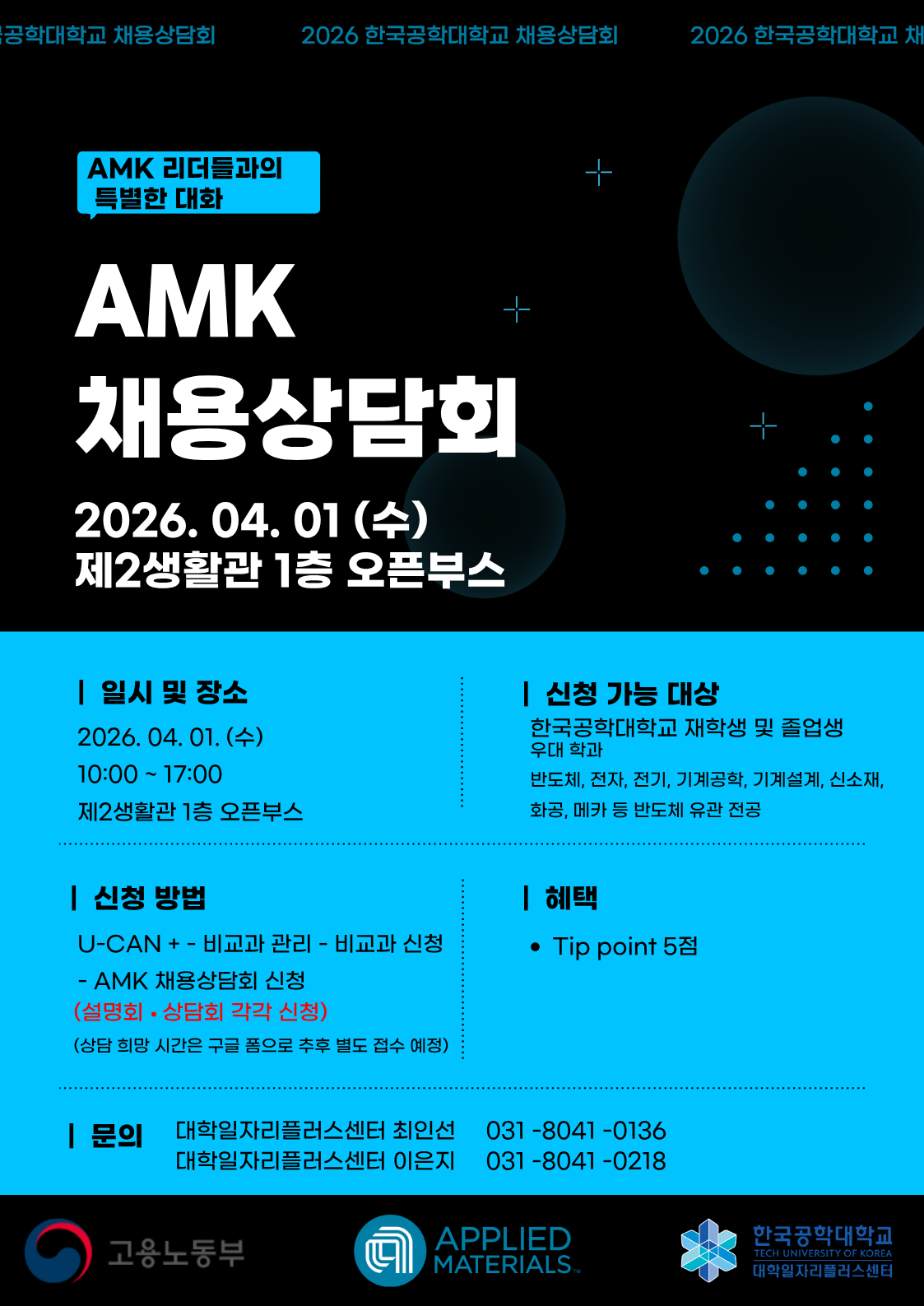 fnctId=bbs,fnctNo=1310 게시물 검색 검색하기 제목 작성자 RSS 2.0 206건, 현재페이지: 1/23 게시글 리스트 대일플센 뉴스 4월호 새글 작성일 2026.04.01 작성자 대학일자리플러스센터 조회 13 2026대한민국 상생 채용박람회 새글 작성일 2026.04.01 작성자 진로취업지원팀 조회 11 흥미진진MBTI진로 프로그램 새글 작성일 2026.03.31 작성자 진로취업지원팀 조회 16 A-Class500'오비오 채용설명회' 새글 작성일 2026.03.31 작성자 진로취업지원팀 조회 12 26'릴레이 산업분석 및 직무특강 새글 작성일 2026.03.30 작성자 진로취업지원팀 조회 15 26'A-class500채용박람회 원정대'중견기업 일자리박람회' 작성일 2026.03.26 작성자 진로취업지원팀 조회 23 26' TU졸업생 선데이 작성일 2026.03.26 작성자 진로취업지원팀 조회 28 26'해외취업 전략수립 특강 작성일 2026.03.25 작성자 진로취업지원팀 조회 25 AMK채용 설명회& 채용 상담회 작성일 2026.03.24 작성자 진로취업지원팀 조회 24 처음 123 1 2 3 4 5 6 7 8 9 10 다음 페이지 다음 끝